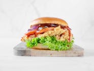 Burger z grillowaną piersią z kurczaka w bułce maślanej ze świeżymi warzywami i sosami.